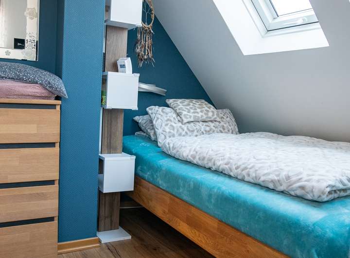 Über den überdachten Hauszugang gelangt man in das großzügige Küchen-/Esszimmer und den angrenzenden Wohnbereich mit Kaminofen und Wintergarten. Im Erdgeschoss befindet sich noch das kleine Gäste-WC. Die Treppe führt in das Obergeschoss mit dem Schlafzimmer, einem kleinen Kinderzimmer sowie dem Duschbad.
