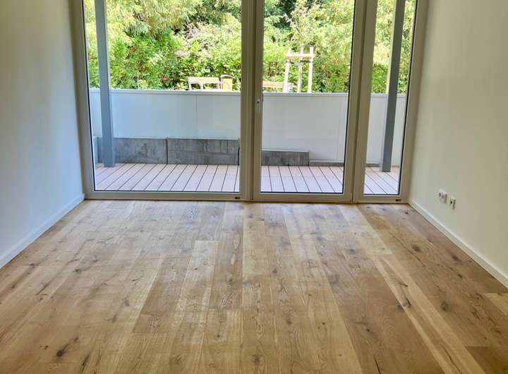 Das Apartment ist in Richtung Osten ausgerichtet und überzeugt mit einer praktischen Raumaufteilung. Der bewusst sparsam gehaltene Eingangsbereich bringt Sie direkt in das Wohn-/Esszimmer mit offen gehaltener Küche und direktem Zugang zum Balkon. Durch die wertige Ausstattung mit rustikalen Eichenholz-Dielen, modernen großformatigen Fliesenböden sowie der schicken Einbauküche, werden Sie sich schnell zuhause fühlen. An das Wohnzimmer angrenzend befindet sich das gemütliche Schlafzimmer mit Zugang in das modern gestaltete Bad en-suite. Selbstverständlich ist hier bereits die Beleuchtung sowie ein Spiegel und Handtuchheizkörper vorinstalliert. Die geräumige Dusche (1,20 x 1,20m) ist überdies bereits mit einer hochwertigen Glasduschabtrennung versehen und barrierefrei zugänglich.