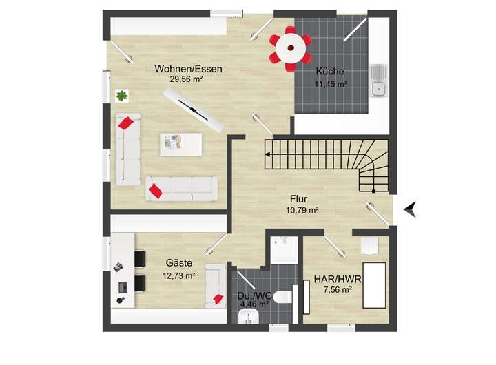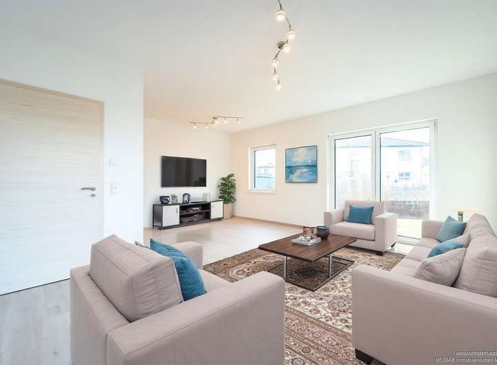 Schon beim Betreten des Hauses öffnet sich ein freundlicher Flur, der den Ton für den restlichen Wohnbereich vorgibt: hell, modern und offen. Von hier aus gelangen Sie in den Hauswirtschaftsraum mit moderner Luft-Wasser-Wärmepumpe, einer vollwertigen Lüftungsanlage, die für ein durchgehend angenehmes Raumklima sorgt, sowie in das stilvolle Gäste-WC mit ebenerdiger Dusche. Ein zusätzliches Zimmer bietet sich perfekt als Büro oder Gästezimmer an. Das Herzstück des Erdgeschosses bildet jedoch der große Wohn- und Essbereich mit offener Küche. Die moderne Einbauküche ist bereits im Preis enthalten und fügt sich harmonisch in den Raum ein. Große Fensterfronten sorgen dafür, dass den ganzen Tag über natürliches Licht ins Haus fällt; dreifach verglaste Fenster mit Rollläden bieten Energieeffizienz.