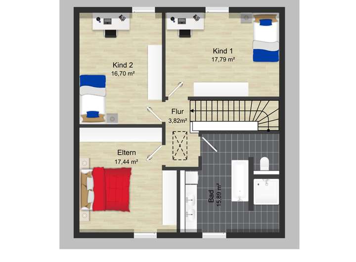 Im Dachgeschoss setzt sich das angenehme Wohngefühl nahtlos fort. Das große Badezimmer lädt mit Badewanne und ebenerdiger Dusche zum Entspannen ein und verfügt zusätzlich über einen Waschmaschinenanschluss. Drei helle, vielseitig nutzbare Zimmer bieten ideale Voraussetzungen für Familienleben, Hobby oder Rückzugsorte. Die bodentiefen Fenster bringen viel Licht in die Räume und verleihen ihnen eine besonders freundliche Ausstrahlung. Ein zusätzlicher Spitzboden ergänzt das Platzangebot und bietet praktischen Stauraum für Dinge, die gut verstaut sein sollen.