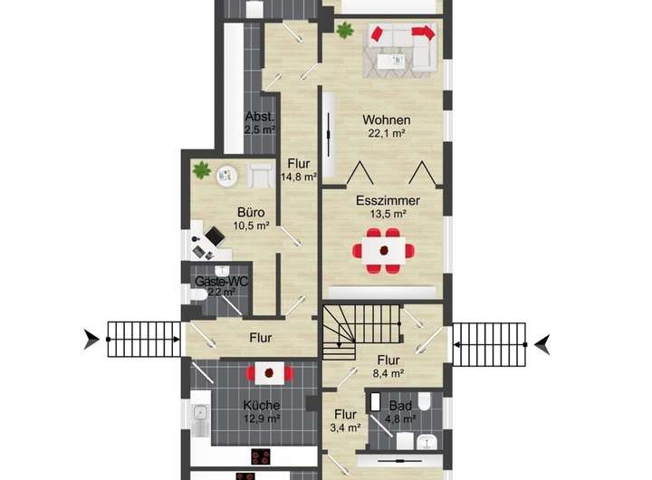 Ebenfalls im Erdgeschoss liegt Wohneinheit 2 mit ca. 110m² Wohnfläche, die über einen separaten Zugang vom ruhig gelegenen Hinterhof betreten wird. Diese großzügig geschnittene Wohnung verfügt über ein Gäste-WC, eine geräumige Küche, ein separates Büro, ein großen Wohn- und Essbereich, ein Tageslichtbad mit Wanne und Dusche sowie ein ruhig gelegenes Schlafzimmer.