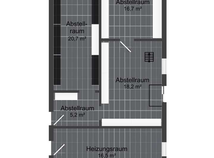 Ergänzt wird das Raumangebot durch das Kellergeschoss, das funktionalen Stauraum bereitstellt. Hier befinden sich vier Abstellräume, die sich ideal für Lagerzwecke eignen – sei es durch die einzelnen Mieter oder gemeinschaftlich. Ein zentraler Heizungsraum komplettiert das Untergeschoss.