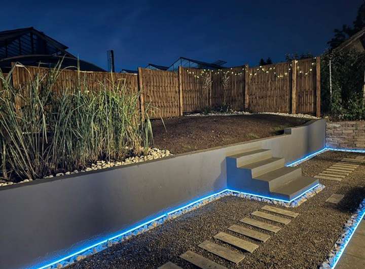 Eine überdachte Terrasse lädt zum Entspannen ein, der Garten bietet Raum für Erholung, und eine stilvolle Außenbeleuchtung setzt das Haus sowie den Garten bei Nacht eindrucksvoll in Szene.