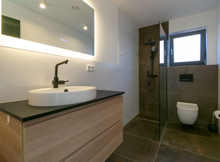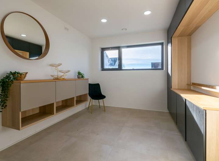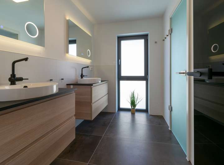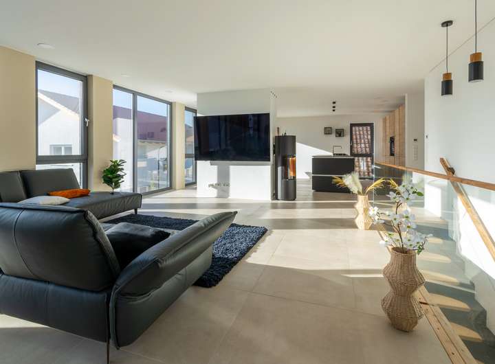 Das Obergeschoss lässt keine Wünsche offen: Ein lichtdurchfluteter Wohn- und Essbereich mit offener, hochwertiger Einbauküche bildet das Herzstück des Hauses. Von hier aus gelangen Sie direkt auf den Balkon, von dem Sie eine schöne Aussicht genießen. Das Elternschlafzimmer mit Ankleide sowie ein weiteres Tageslichtbad mit bodenebener Dusche sorgen für ein Maximum an Wohnkomfort.