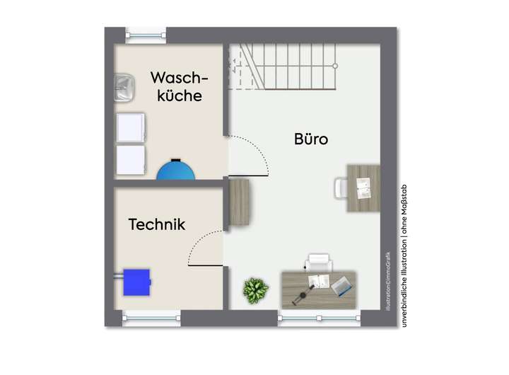 Im Untergeschoss befindet sich der Technikraum mit einer energieeffizienten Luft-Wärmepumpe. Fußbodenheizung in allen Wohnräumen, elektrische Rollläden sowie eine Belüftungsanlage für stetig frische Raumluft unterstreichen den hohen technischen Standard des Hauses.
