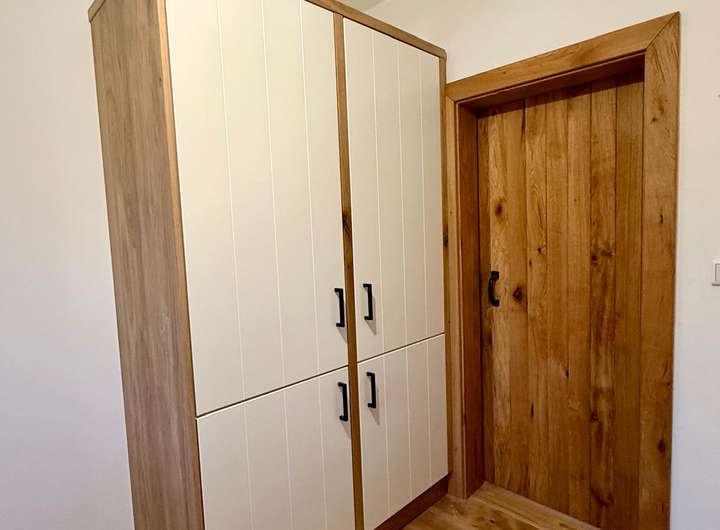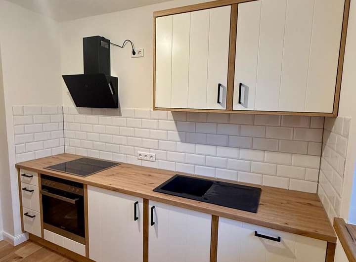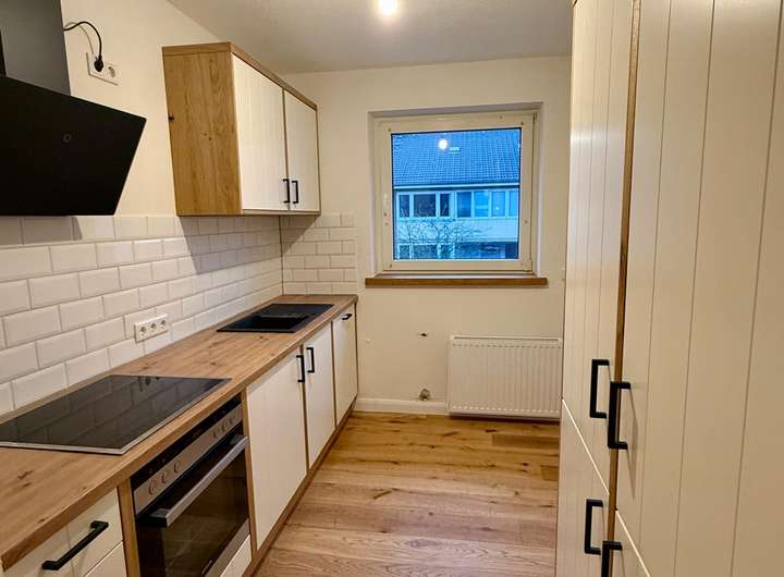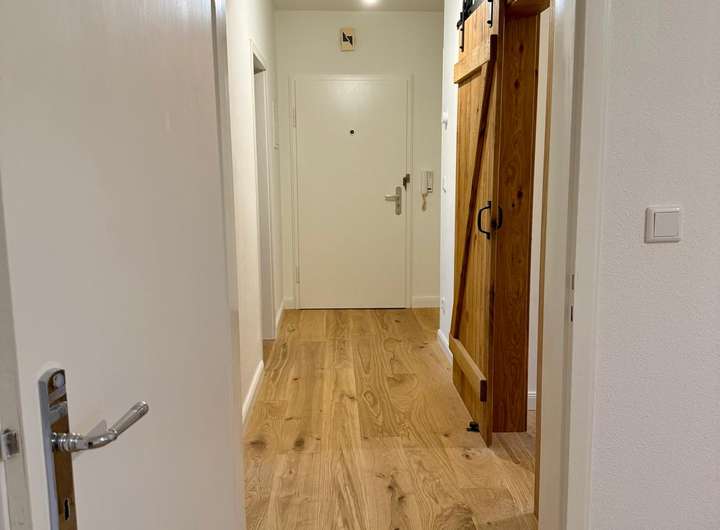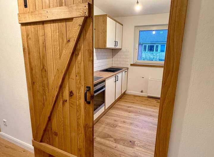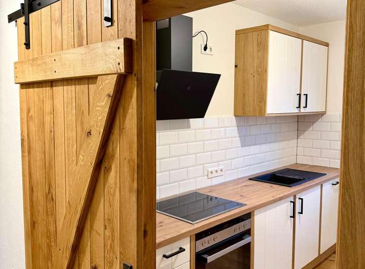 In der gesamten Wohnung wurde edles Eichenparkett verlegt, das zusammen mit den Fensterbänken aus massiver Eiche ein harmonisches, hochwertiges Gesamtbild erzeugt. Ein Highlight ist die vom Tischler gefertigte Einbauküche, teilmassiv aus Eiche, die individuell geplant und maßgefertigt wurde. Besonders hervorzuheben ist die charaktervolle Stallrolltür aus massiver Eiche, ebenfalls Tischlerarbeit, die der Küche eine einzigartige Note verleiht. Ausgestattet mit hochwertigen Siemens-Elektrogeräten – einschließlich Einbauspülmaschine und Einbaukühlschrank – erfüllt die Küche auch gehobene Ansprüche an Komfort und Funktionalität.