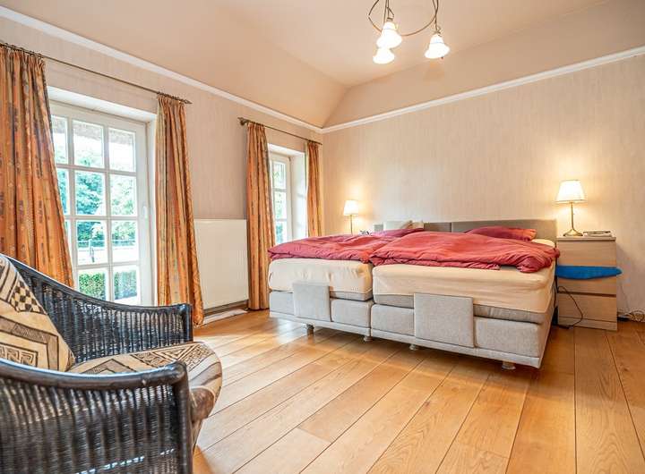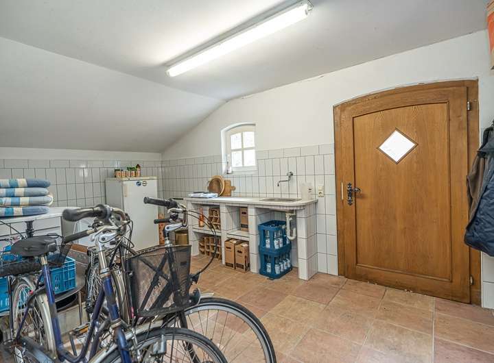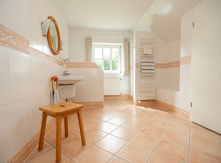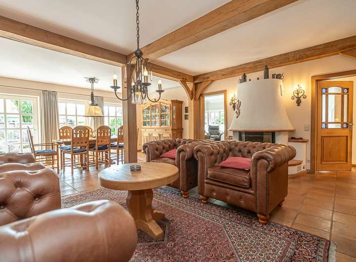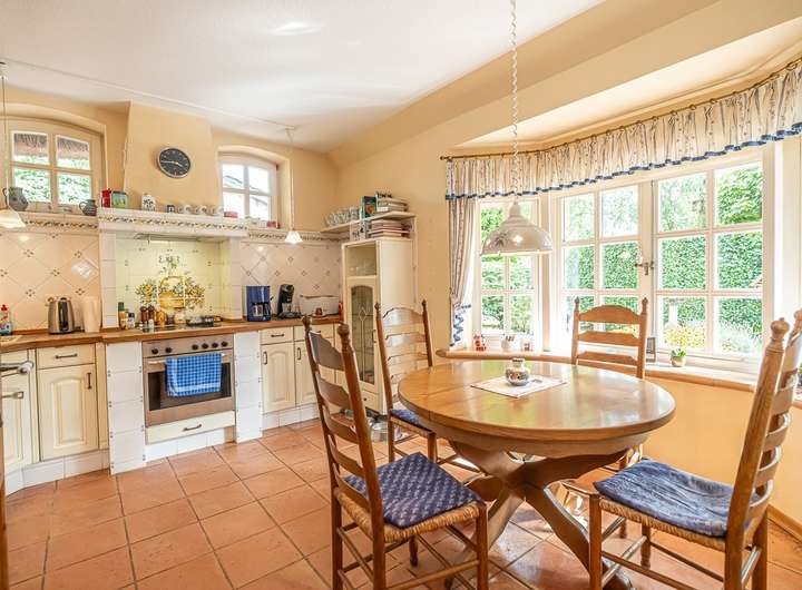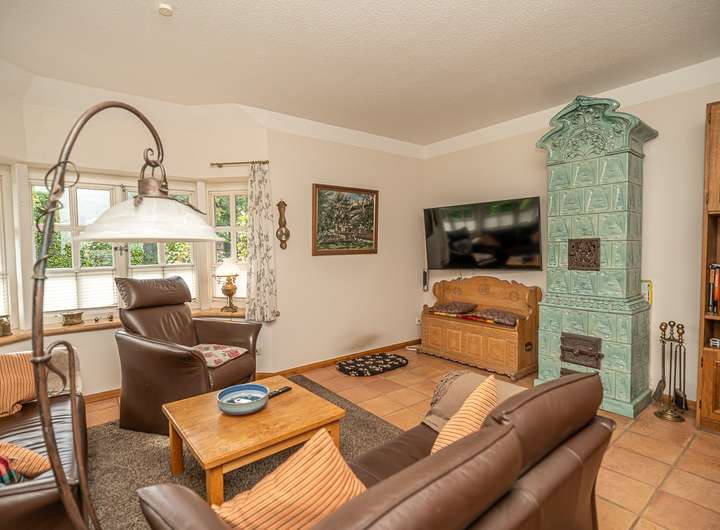 Der Eingangsbereich des Hauses lädt zum Verweilen ein. Die sehr eindrucksvolle Eingangstür und der dahinterliegende Windfang versprühen einen ganz besonderen Flair, welcher sich durch das ganze Haus zieht. Das offene Ständerwerk im riesigen Wohnbereich, mit anliegender und separierter Küche zeigen, dass auf jedes Detail geachtet wurde. Auch der dort befindliche wunderschöne historische und gern genutzte Kachelofen trägt zum wohligen Wohncharakter bei. Im Erdgeschoss wurden hochwertige original Handform Cottoplatten und eine moderne Fußbodenheizung verlegt, die den ganz besonderen Landhauscharme betonen. Im restlichen Bereich wurden ebenfalls hochwertige Fliesen verwendet. Das Süd-West Zimmer wurde mit einem wunderschönen Eckerker versehen, wodurch das jetzige Wohnzimmer einen tollen Lichteinfall genießt und der dort befindliche Kachelofen besonders zur Geltung kommt.
