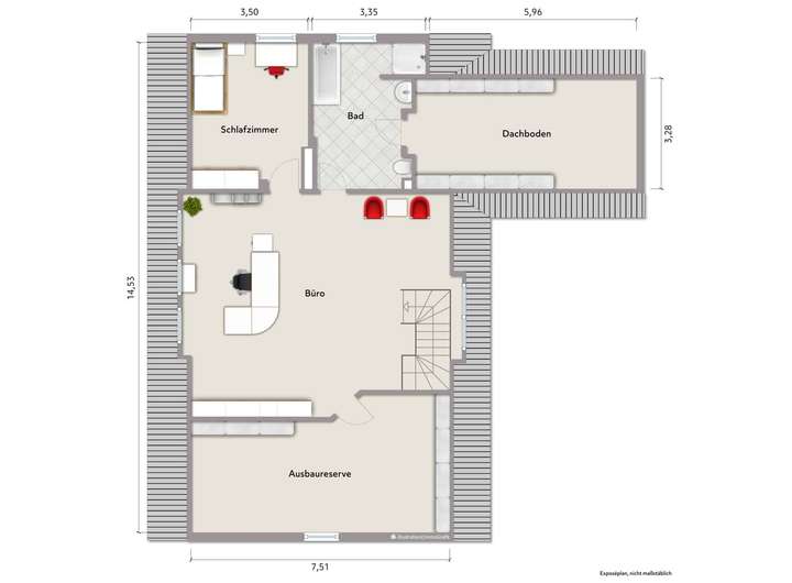 DG: Schlafzimmer, Büro, Bad, Ausbaureserve, Dachboden