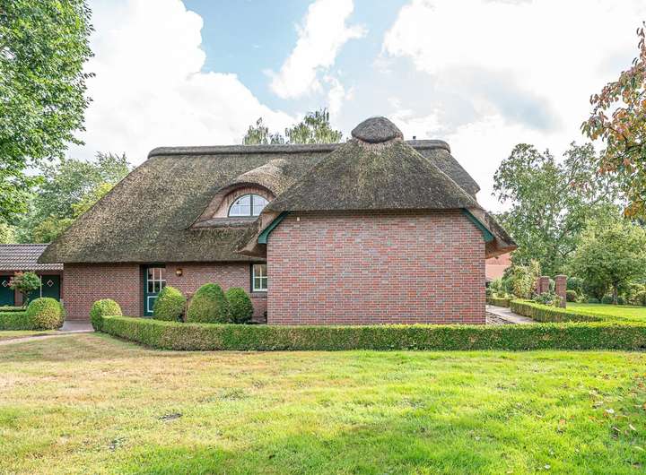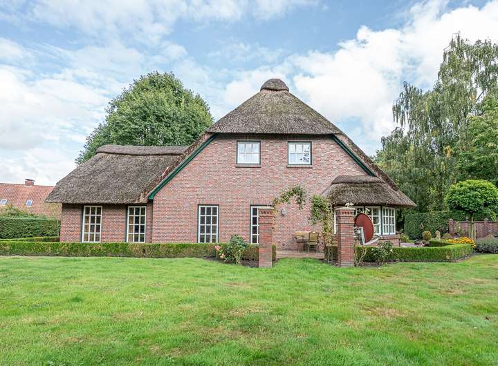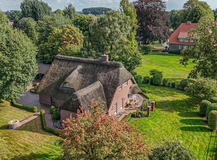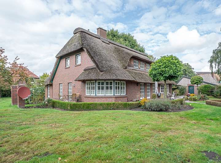 Im Jahre 2000 wurde dieses traumhafte Reetdachhaus errichtet. Es wurde nicht nur massiv, sondern auch mit hochwertigen Baumaterialien erbaut und strahlt durch seine moderne Architektur, dem klassischen Reetdach und seinen vielen Möglichkeiten einen ganz besonderen Wohncharakter aus. Die großzügige Wohnfläche von fast 250 m² und das sehr schön eingewachsene Grundstück mit altem Baumbestand und 1.964 m² ermöglichen viele Nutzungen und Entfaltungsräume. Das Grundstück wirkt durch die angrenzenden Wiesen im Westen nicht nur viel größer, sondern erweckt einen parkähnlichen Charme durch die weitläufigen Sichtachsen über die Felder Richtung Sonnenuntergang. Ebenfalls vorhanden ist ein riesiges geschlossenes und massiv erbautes Doppelcarport, mit einem großen angrenzenden gedämmten und beheizten Raum, der als Waschküche oder HWR nutzbar ist. In den Garagen lässt sich ohne weiteres eine Werkstatt integrieren.
