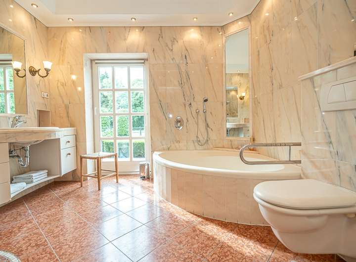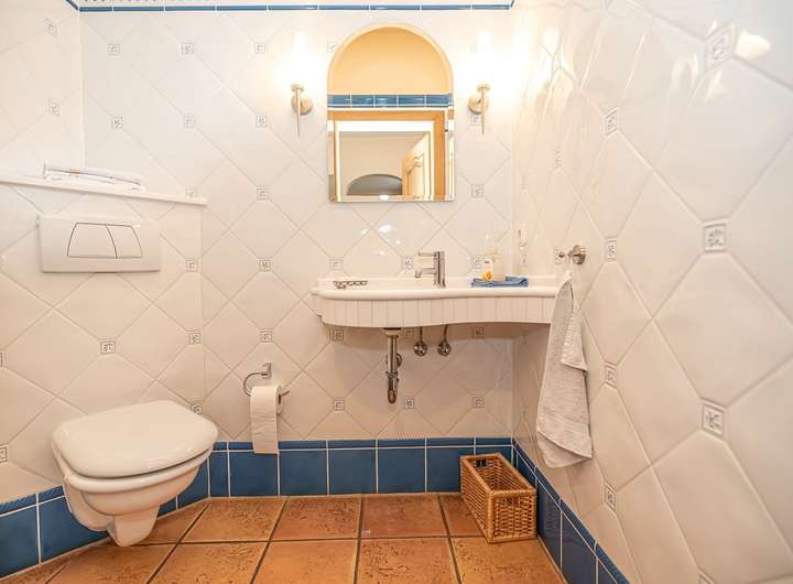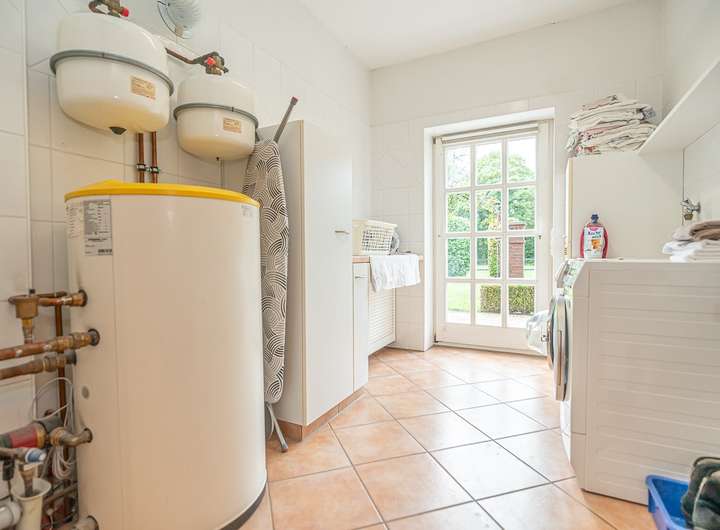 Ein separater Trackt geht vom Wohnbereich ab. Dort befinden sich zwei große Tageslichtbäder, ein nützlicher Hauswirtschaftsraum und das ebenerdige Schlafzimmer. Nicht zu vernachlässigen sind zum anderen das praktische Gäste-WC im vorderen Bereich des schönen Anwesens, sowie der separate Seiteneingang durch einen smarten Lagerraum.