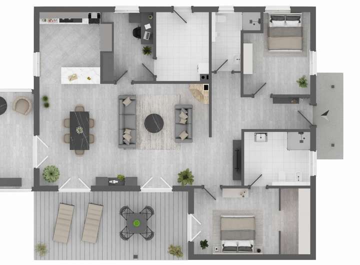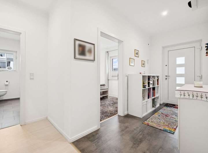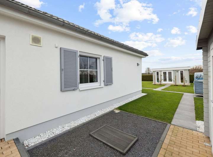 Eine Luftwärmepumpe mit Wärmerückgewinnung sowie eine Zwangsbelüftung gewährleisten ein gesundes Raumklima. Ergänzend tragen Solarmodule auf dem Dach zu einem besonders effizienten und nachhaltigen Energiehaushalt bei. Mit der Energieeffizienzklasse A+ und einer Garage inklusive Wallbox erfüllt der Bungalow schon heute die Anforderungen von morgen.