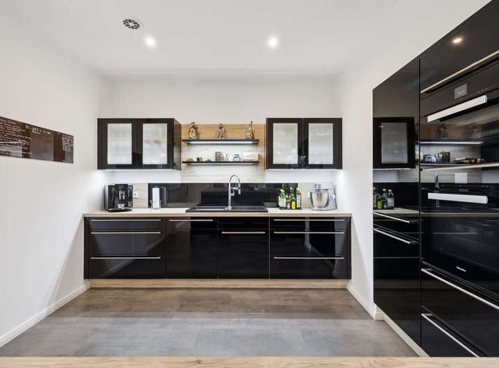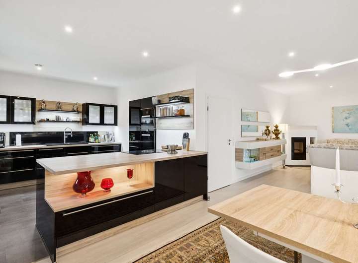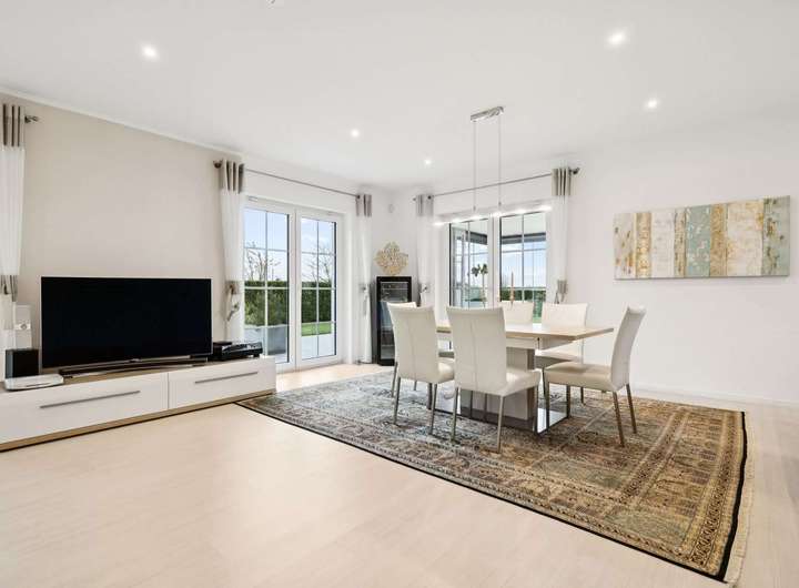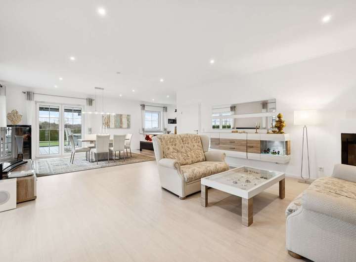 Das Herzstück bildet der offene Wohn- und Küchenbereich, in dem Helligkeit und Weite aufeinander treffen. Die hochwertige Einbauküche mit Miele-Geräten fügt sich nahtlos in das elegante Raumkonzept ein. Vom Wohnbereich aus gelangen Sie in den charmanten Wintergarten, der mit zwei Infrarotheizungen ausgestattet ist und Ihnen zu jeder Jahreszeit einen behaglichen Rückzugsort bietet.