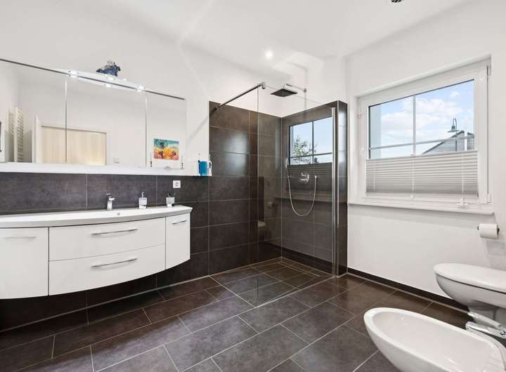 Das Hauptschlafzimmer überzeugt mit einem begehbaren Kleiderschrank sowie einem Bad en Suite. Von hier aus haben Sie direkten Zugang zur Terrasse. Das private Badezimmer ist mit einer ebenerdigen Walk-in-Dusche, einem WC und Bidet ausgestattet. Ein weiteres Duschbad, vom Flur aus erreichbar, mit bodengleicher Dusche, WC und Urinal ergänzt das Raumangebot – ideal für Gäste oder Familienmitglieder.