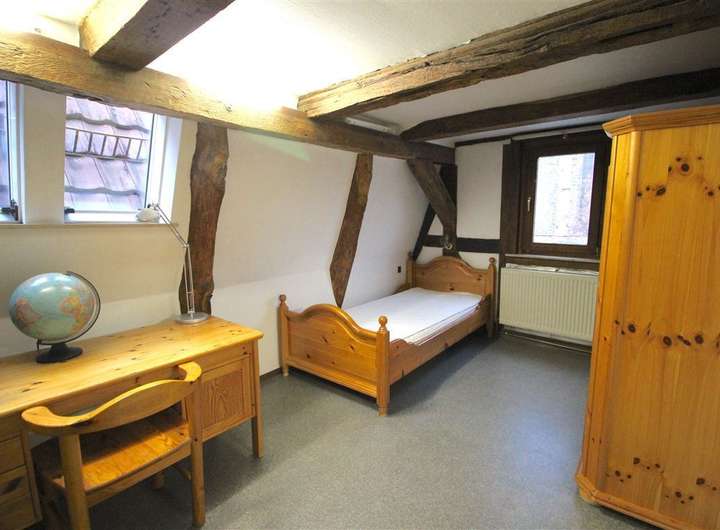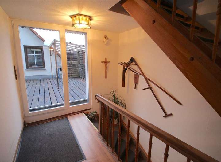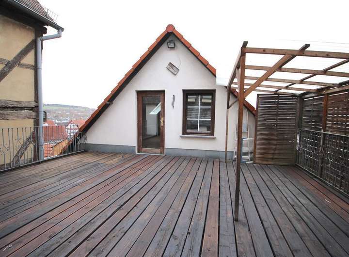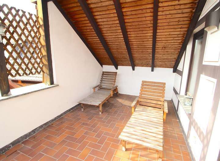 Das 2. Obergeschoss ist zweigeteilt mit einer Terrasse in der Mitte. Auf dieser Ebene befindet sich eine gepflegte möblierte Wohnung mit zwei Zimmern, Küche und Wannenbadezimmer. Die Terrasse ist aus dem Schlafbereich der Wohnung oder aus dem Hausflur zu begehen. Über die Terrasse erreichen Sie den Dachbereich des Anbau-Hauses, welcher wie eine Art Einliegerwohnung mit den Appartement-Zimmern Wohnbereich und Schlafbereich ausgestattet ist. Mit einer Badergänzung ließe sich hier eine separate Wohneinheit oder auch zusätzlicher Gästebereich schaffen.