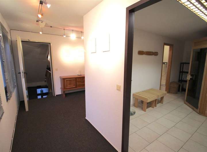 Das darüber liegende 1. Obergeschoss kann entweder als volle Wohnebene auf ca. 150 qm Wohnfläche plus Loggia genutzt oder, mit Ergänzung eines zweiten Badezimmers, in zwei Wohneinheiten geteilt werden. In dieser Ebene sind ein WC mit Waschbecken sowie ein Duschbad und ein separater Raum mit Sauna und Solarium vorhanden. Es gibt zwei Wohnungseingänge. Eine zweite Gas-Etagenheizung, Baujahr 2024, wurde in der Küche dieser Wohnebene verbaut. Die Wohnung kann voll möbliert übernommen werden.