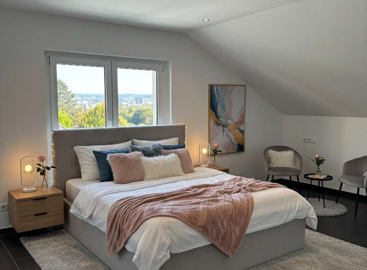 Die Ausstattung ist durchweg hochwertig und auf Langlebigkeit ausgelegt: Vollwärmeschutz, moderne Dach- und Sparrenisolierung, 3-fach verglaste Fenster (teilweise 2-fach), elektrische Rollläden, neue Innen- und Außentüren sowie eine Holz-Pellets-Zentralheizung aus dem Jahr 2022 in Kombination mit einer thermischen Solaranlage. UG, EG und DG sind mit Fußbodenheizung ausgestattet, während das OG über elegante Plattenheizkörper verfügt.