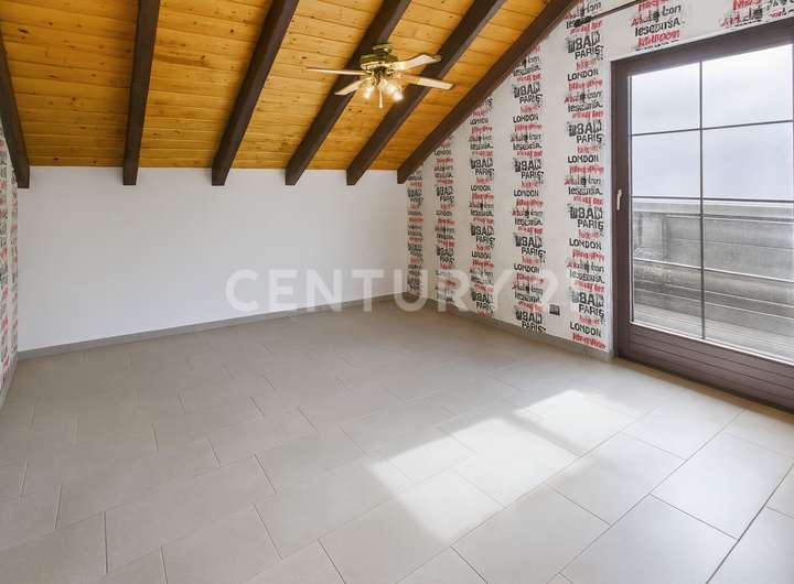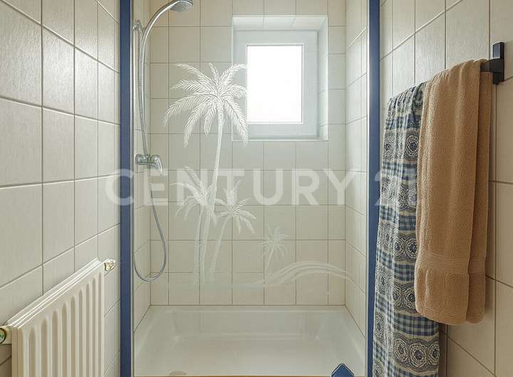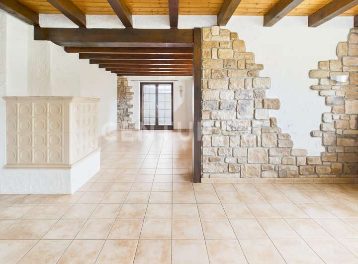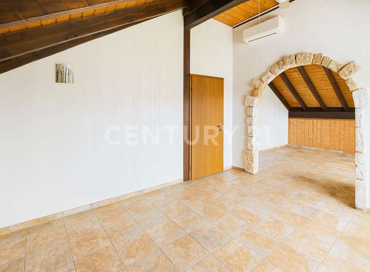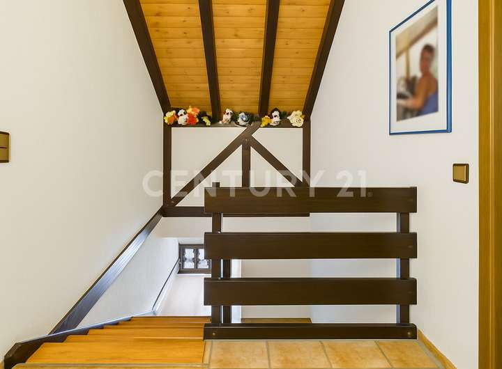 Im Erdgeschoss empfängt Sie ein großzügiger Wohn- und Essbereich mit bodentiefer Aussicht in den Garten, sichtbaren Echtholzbalken an der Decke und einer hochwertigen Einbauküche mit exklusiven Geräten. Eine Fußbodenheizung sorgt für angenehme Wärme und Wohnkomfort. Von hier gelangen Sie auf den eindrucksvollen, rund 40–50 m² großen Panoramabalkon, dessen Geländer erneuert wurde. Ergänzt wird diese Ebene durch eine einladende Diele, Gäste-WC sowie ein hochwertig ausgeführtes Echtholztreppenhaus.