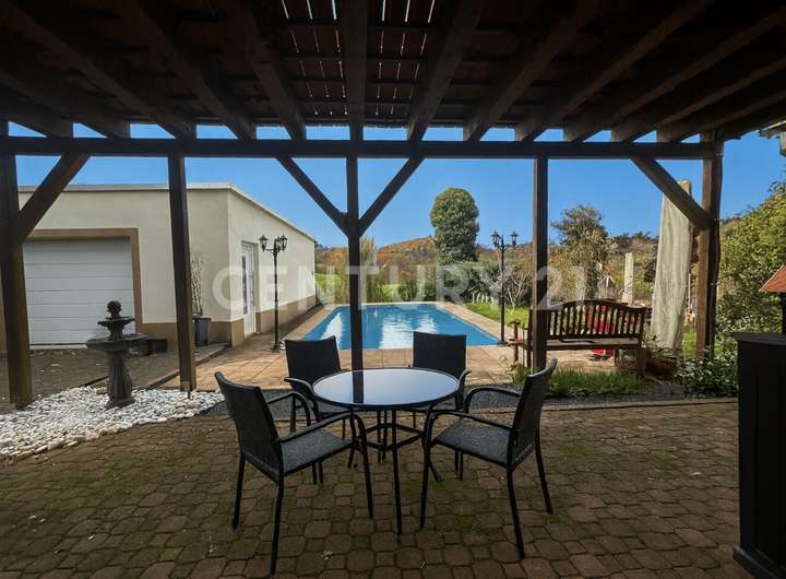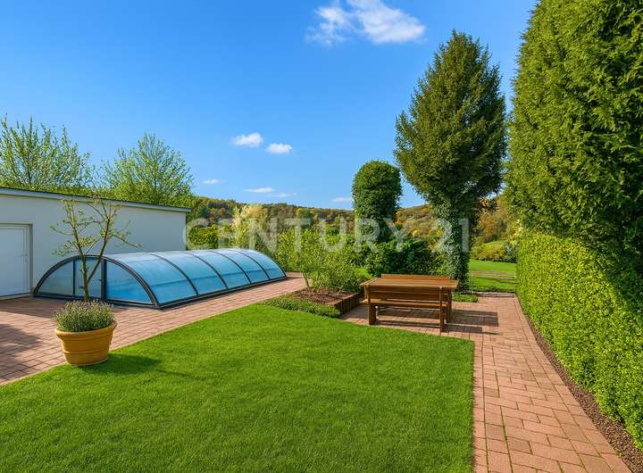 Der Außenbereich überzeugt durch einen beheizbaren Pool mit hochwertiger Abdeckung, gepflegte Grünflächen und erneuerte Terrassenbereiche – der große Terrassenteil im Erdgeschoss wurde mit langlebigem WPC belegt. Fahrzeuge finden Platz in mehreren Außenstellplätzen, einer integrierten Garage sowie einer massiv gebauten Doppelgarage mit Tiefe für zwei hintereinander geparkte Fahrzeuge.