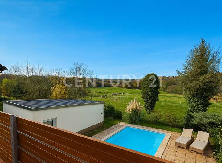 In absoluter Toplage von Ottweiler präsentiert sich dieses großzügige Einfamilienhaus mit Einliegerwohnung als seltenes Angebot für Menschen, die Ruhe, Weite und gehobenes Wohnen schätzen. Der unverbaubare Blick über Felder, Grünflächen und die angrenzende Pferdekoppel verleiht dem Anwesen eine Atmosphäre, die man sonst nur im Urlaub findet – hier wird Wohnen zum Ankommen und Durchatmen.