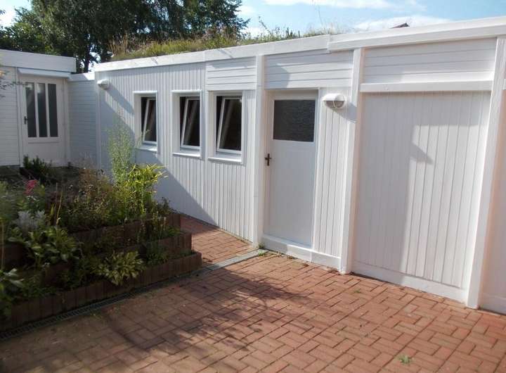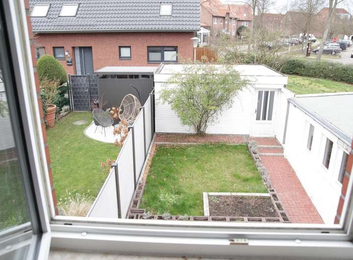 Das Grundstück ist 158 qm groß und besitzt neben einem Vorgarten und Garten zusätzlich eine Terrasse (17 qm), eine Garage (17 qm) und einen Gartenschuppen (14 qm). Die Gemeinschaftsflächen der Grundstücksgemeinschaft ‘Akazienhain‘ stehen mit einer Grünfläche und einem eigenen Kinderspielplatz zusätzlich zur Verfügung. Wenige Meter vom Hauseingang entfernt können vier PKW-Stellplätze an der Zufahrt zum Innenhof von den Anwohnern genutzt werden.