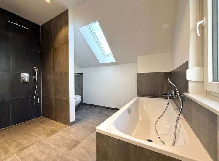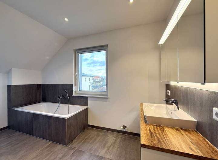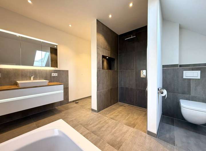 • Modernes Tageslichtbad mit Badewanne, ebenerdiger Dusche, hochwertigem Waschtisch und Spiegelschrank