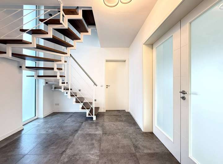 - Innentreppe: holzoptik (dunkelbraun), Stahlgeländer in weiß mit Edelstahl-Handlauf