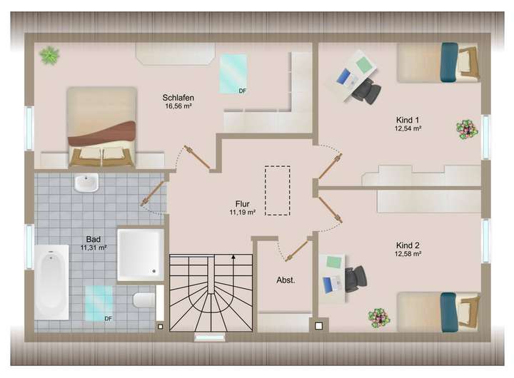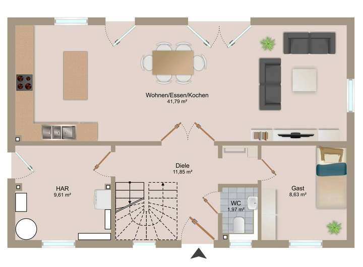 Zur Wahrung der Privatsphäre der Nachbarschaft sowie zur optimierten Darstellung der Immobilie wurden einige Aufnahmen digital bearbeitet. Dabei kann es insbesondere in Bezug auf angrenzende Grundstücke oder deren Umgebungsdarstellung zu Abweichungen vom tatsächlichen Erscheinungsbild kommen. Die wesentlichen Merkmale des angebotenen Objekts sind authentisch dargestellt. Die in den Grundrissen verwendeten Materialien, Farben und Möblierungen sind nur beispielhaft gewählt und dienen nur der besseren Visualisierung.