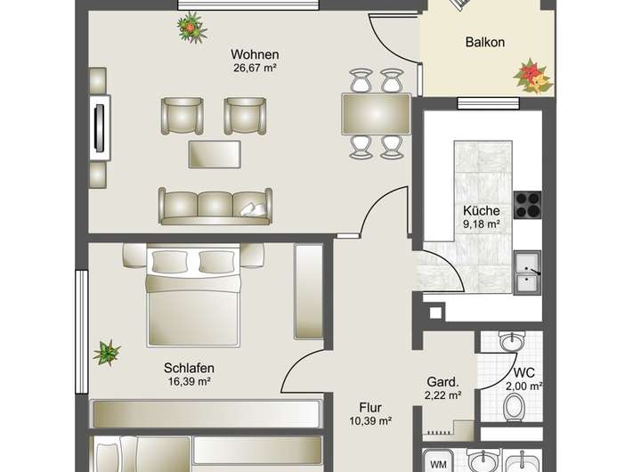 Beim Betreten der Wohnung eröffnet sich eine durchdachte Raumaufteilung mit insgesamt 3,5 Zimmern. Zwei gemütliche Schlafzimmer bieten idealen Rückzugsraum. Das Badezimmer ist funktional gehalten und bietet alles, was man im Alltag benötigt. Der offene Wohn- und Essbereich bildet das Herzstück der Wohnung und ermöglicht den direkten Zugang zum sonnigen Balkon – perfekt für entspannte Momente im Freien.