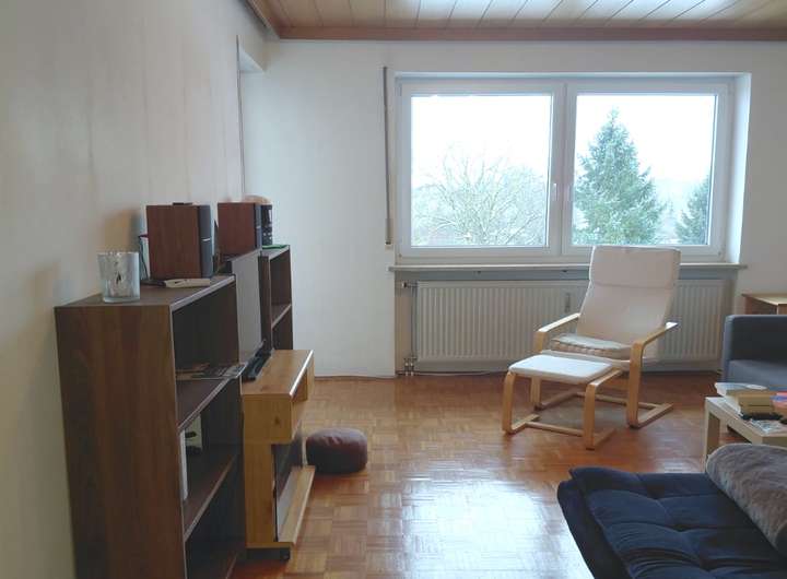 Das große Wohnzimmer bietet genügend Möglichkeiten für eine individuelle Raumaussstattung mit Zugang zum Balkon. Die grosse Fensterfront öffent den Raum durch viel Lichteinfall.