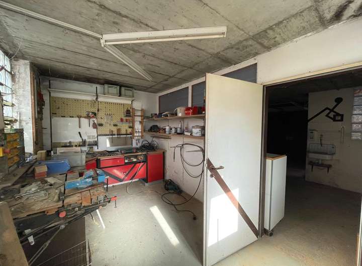Zum Haus gehört außerdem eine große Einzelgarage mit angrenzender Werkstatt, die einen direkten Zugang in den Garten bietet – ein Paradies für Hobbyhandwerker. Eine rückseitige Haustür ermöglicht das Betreten des Hauses über den Garten. Auf dem Grundstück befindet sich zudem eine großzügige Hütte, ideal für Gartengeräte oder Möbel.