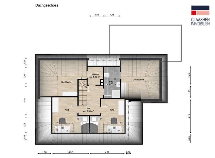 Das Dachgeschoss beherbergt zwei geräumige Kinderzimmer, die viel Privatsphäre und Gestaltungsspielraum bieten. Ein zentral gelegener Flur verbindet alle Räume und führt zum Tageslichtbad auf dieser Ebene. Zusätzlich stehen zwei separate Dachböden zur Verfügung, die wertvollen Stauraum für saisonale Gegenstände, Dekorationen oder selten genutzte Utensilien bieten – ideal, um Ordnung im Wohnbereich zu halten.