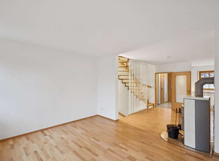 Das großzügige, helle Wohnzimmer im Erdgeschoss verfügt über einen Kaminofen und ist mit hochwertigem Parkettboden versehen.