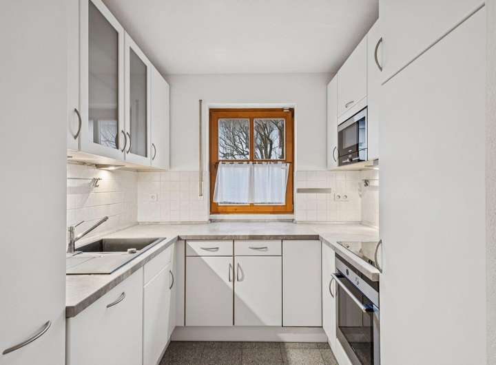 Das helle, geräumige Wohnzimmer im Erdgeschoss verfügt über eine offene moderne Einbauküche. Die Einbauküche ist vollausgestattet mit einem Geschirrspüler, einer Kühl,- und Gefrierkombi, einem E- Herd und einer Mikrowelle. Einem sofortigen Einzug steht demnach nichts im Weg.