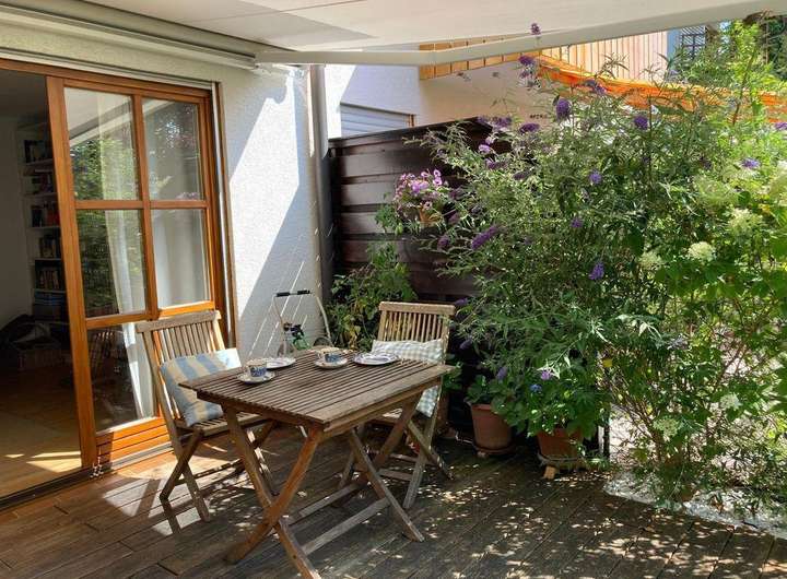 Die Terrasse verfügt über eine elektrische Markise mit Fernbedienung.