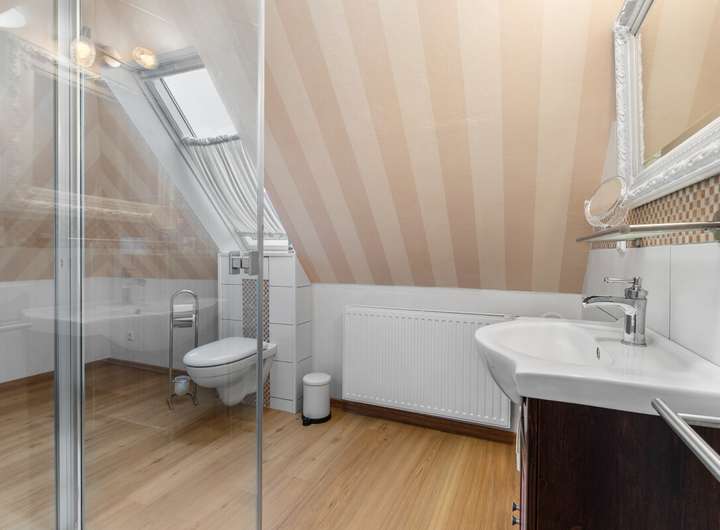 Die zweite Wohneinheit mit rund 77,9 m² erreichen Sie über einen seitlichen separaten Eingang. Im Erdgeschoss befindet sich die Diele sowie ein modernes Duschbad, welches zusätzlich die Anschlüsse für die Waschmaschine bereit stellt. Über eine hochwertige Vollholztreppe gelangen Sie in das offen gestaltete Dachgeschoss. Hier erwartet Sie ein lichtdurchfluteter Wohn- und Essbereich mit integrierter Küche – ein einladender Ort für gemütliche Stunden. Ein weiteres Badezimmer sowie ein großzügiges Schlafzimmer bieten viel Komfort und machen diese Einheit zu einem vollständig autarken Wohnbereich.