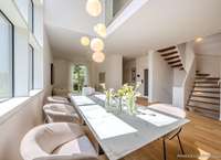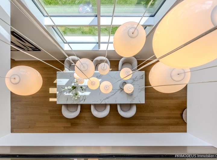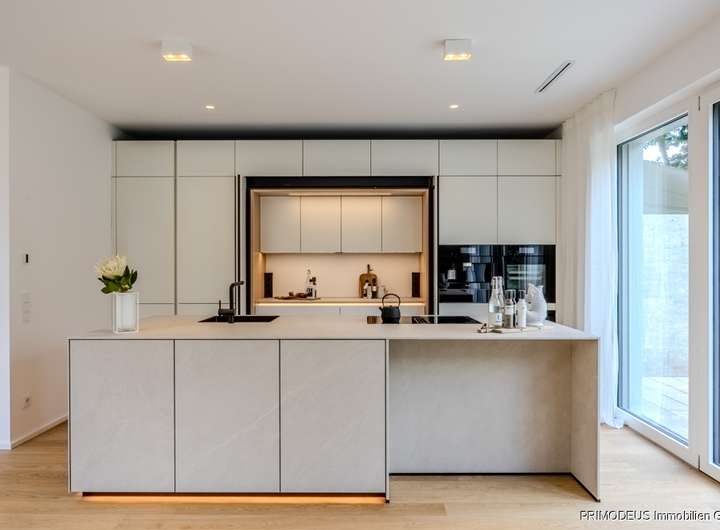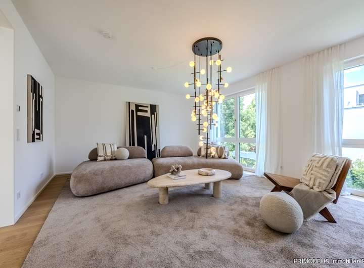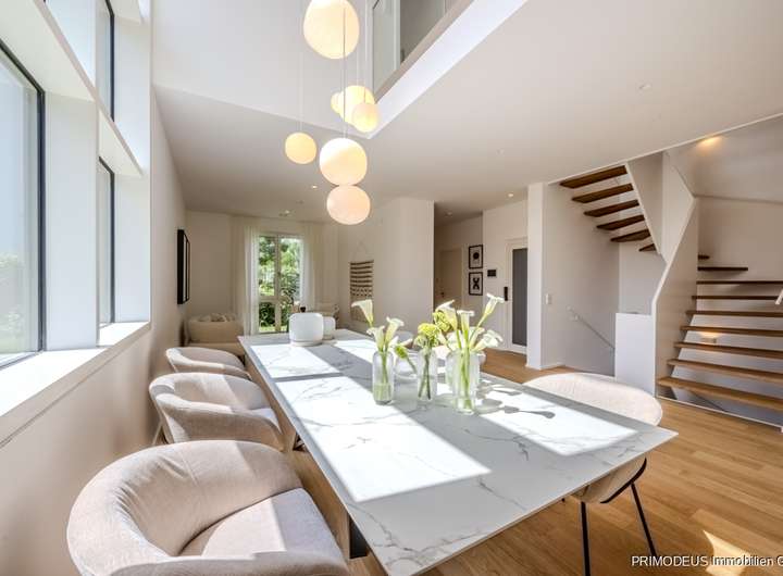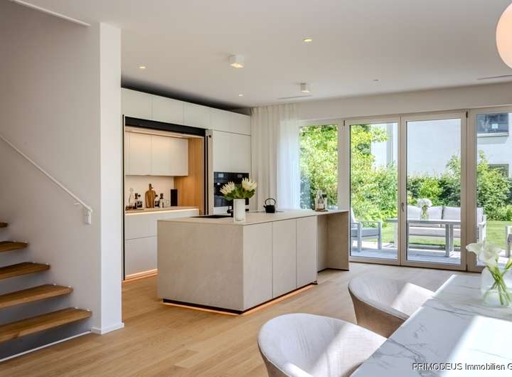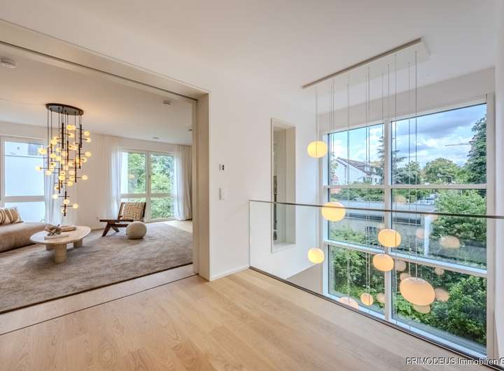 Große Fensterfronten und Terrassen auf Garten- und Dachebene öffnen den Blick in die Parklandschaft und integrieren die Natur in das Wohnerlebnis. Dieses naturnahe Lebensgefühl in zentraler Lage ist eine echte Rarität. Hochwertige Materialien und eine klare, reduzierte Formsprache unterstreichen den Anspruch an Architektur und Design und prägen den stilvollen Gesamteindruck.