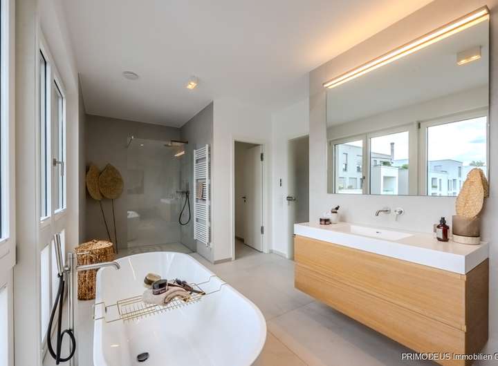 Das hier angebotene Haus ist schon errichtet und befindet sich derzeit in der finalen Ausbauphase. Die gezeigten Bilder zeigen eine bereits fertiggestellte und verkaufte Referenzvilla innerhalb des Ensembles. Das angebotene Haus wird in gleicher architektonischer Qualität voraussichtlich Ende Juli 2026 fertiggestellt – selbstverständlich mit der Möglichkeit, einzelne Details noch nach individuellen Vorstellungen zu gestalten bis etwa Anfang des kommenden Jahres.
