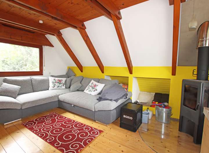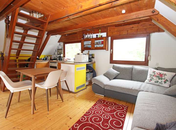 Über eine Treppe erreichen Sie den Schlafbereich unter dem Spitzdach, der ausreichend Platz für Betten und Stauraum bietet.