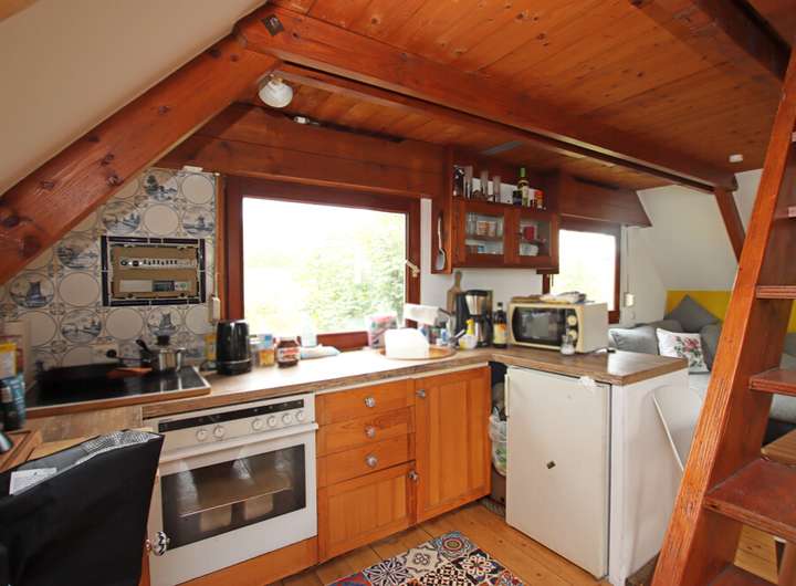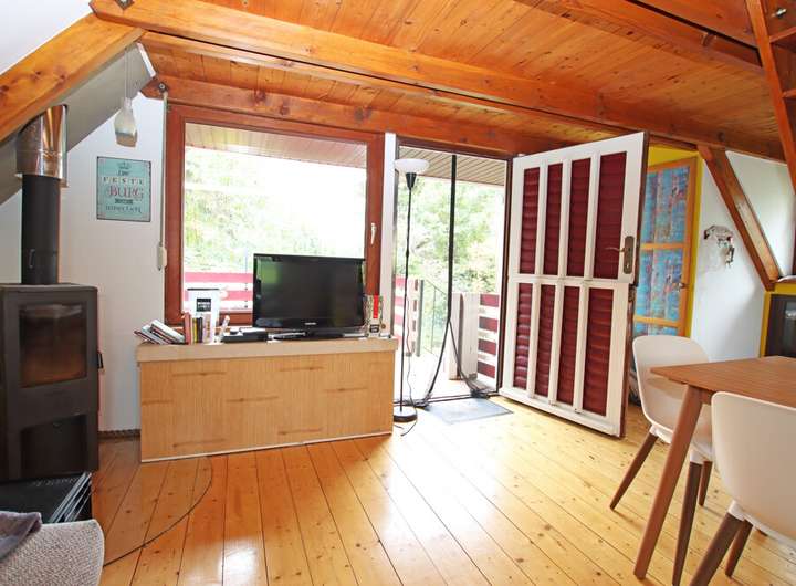 Im Inneren empfängt Sie ein lichtdurchfluteter Wohnbereich, der durch seine warme Holzoptik und die offene Raumgestaltung eine gemütliche Atmosphäre schafft. Die integrierte Einbauküche ist mit Herd, Ofen und Waschbecken ausgestattet und fügt sich harmonisch in den Wohnraum ein. Ein Kaminofen sorgt zusätzlich für wohlige Wärme und ein behagliches Ambiente. Ideal für gemütliche Stunden zu jeder Jahreszeit.