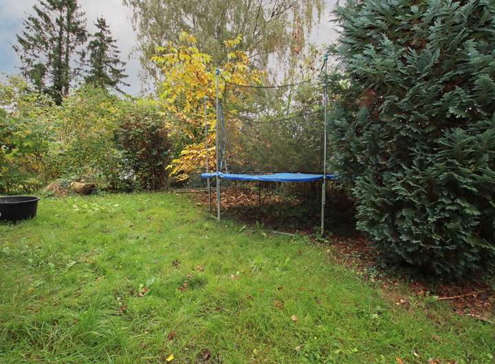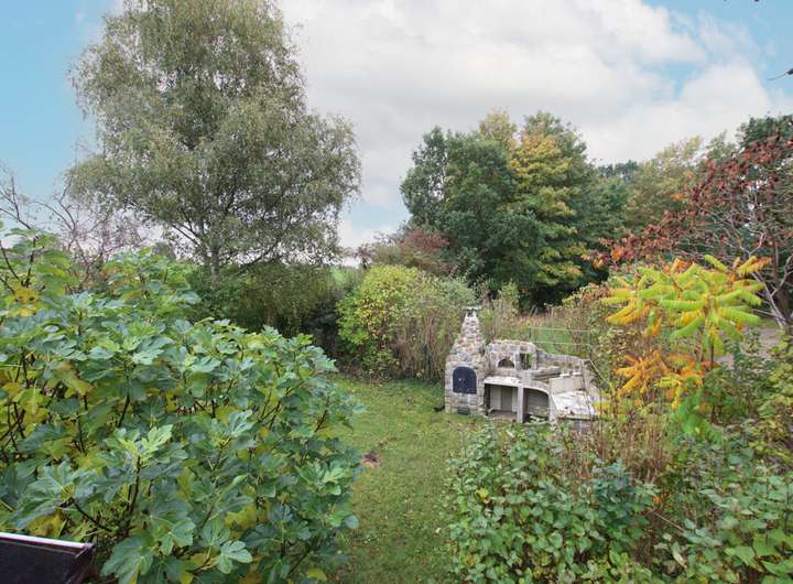Der liebevoll angelegte Garten lädt mit einer aus Stein errichteten Draußen-Küche mit Grill und einem Hochbeet zum Verweilen ein. Verschiedene Sitzmöglichkeiten schaffen Rückzugsorte und machen das Grundstück zu einem idealen Platz für Ruhe und Erholung.