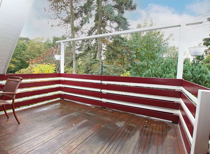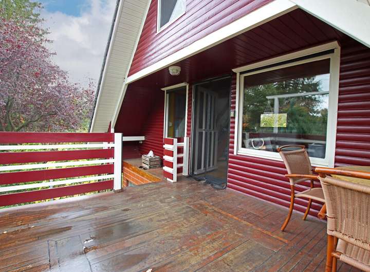 Schon beim Betreten des Grundstücks spüren Sie den besonderen Charme dieser Immobilie. Über eine Treppe gelangen Sie auf die großzügige Teakholzterrasse, die von einem Holzgeländer eingefasst ist und zum Entspannen in der Sonne einlädt.