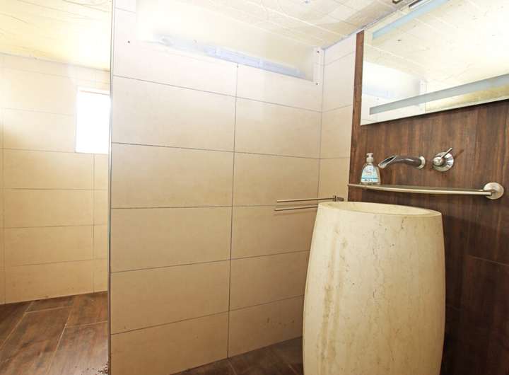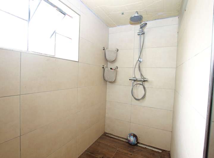 Das modernisierte Badezimmer befindet sich in einem der beiden Garagenräume und ist mit Waschbecken und Dusche ausgestattet. Eine Toilette gibt es aktuell nicht.