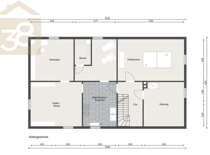 Der Vollkeller bietet viele Nutzungsmöglichkeiten. Neben einem Hobbyraum und einer Werkstatt stehen Ihnen eine Sauna, eine Waschküche sowie der Heizungsraum zur Verfügung.