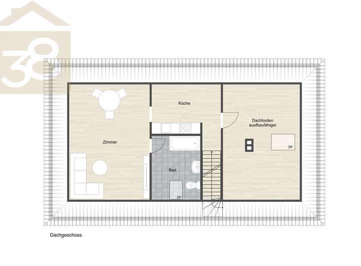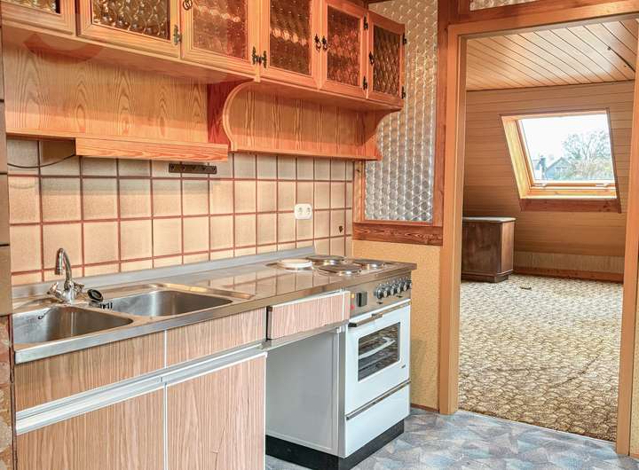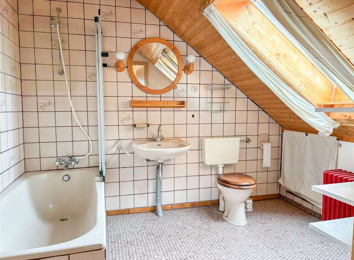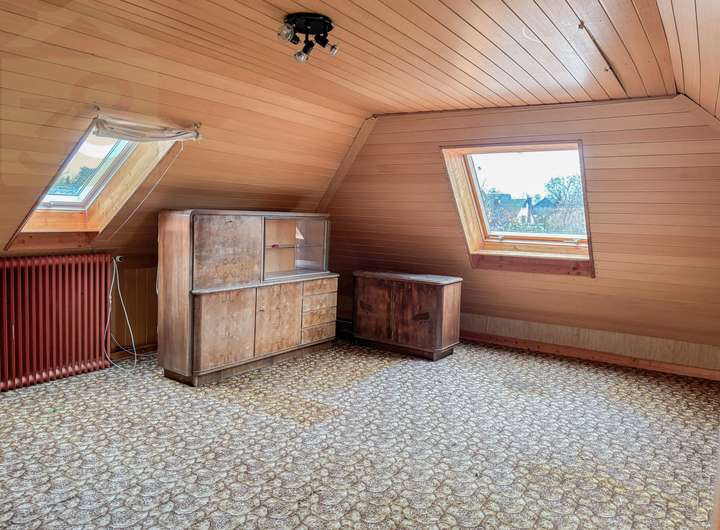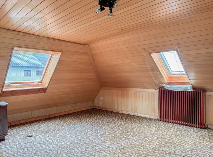 Das Dachgeschoss ist teilweise ausgebaut und umfasst bereits ein großzügiges Zimmer, das sich hervorragend als Studio, Hobbyraum oder zusätzliches Schlafzimmer eignet. Eine eigene Küche mit Einbauküche macht diesen Bereich vielseitig nutzbar. Das vorhandene Badezimmer mit Badewanne, WC und Waschbecken ermöglicht eine nahezu unabhängige Nutzung des Dachgeschosses – ideal für Gäste, ein erwachsenes Kind oder als Rückzugsort zum Arbeiten. Ein weiterer Raum bietet zusätzliches Ausbaupotenzial, etwa für zusätzliche Wohnfläche, Stauraum oder ein individuell gestaltetes Zimmer. Damit eröffnen sich hier noch viele Möglichkeiten, die Immobilie an die eigenen Bedürfnisse anzupassen.