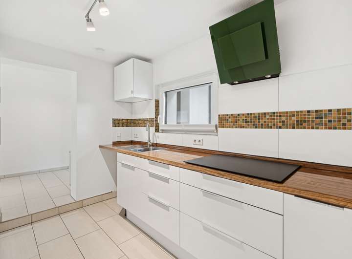 Im Erdgeschoss empfängt Sie eine Diele, von der aus Sie den offenen Wohn- und Essbereich, die moderne Küche, ein weiteres Zimmer – ideal als Gäste- oder Arbeitsbereich – sowie ein Duschbad und eine zusätzliche Vorküche mit Vorratsraum erreichen.