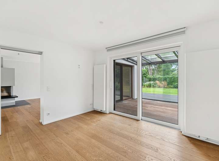 Im kaum einsehbaren Garten verteilen sich zwei Bankirai-Terrassen, ein hochwertiger Wintergarten mit elektrisch steuerbarem Glasdach sowie ein freier Blick über die angrenzenden Felder.