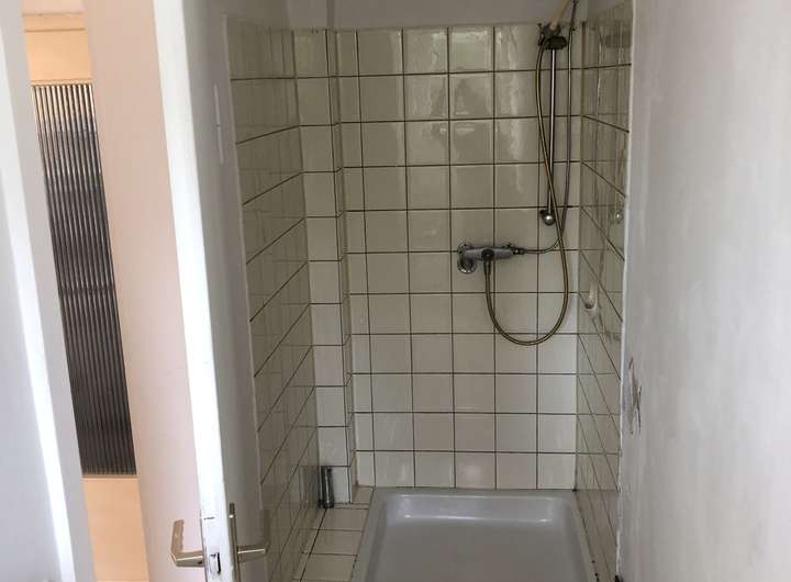 Bad mit Dusche und WC. Die Wohnung verfügt über eine Kochnische im Wohnzimmer.