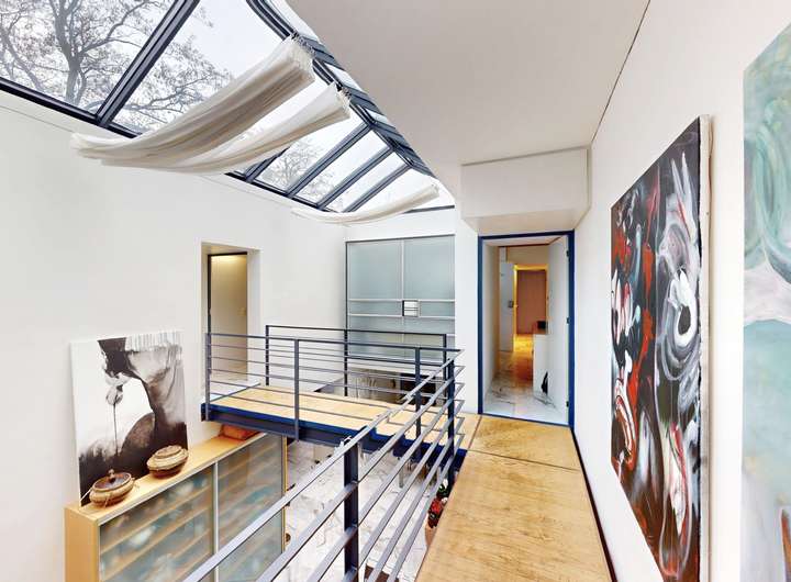 Der Weg durch das Haus ist mehr als reine Bewegung – er wird zum Erlebnis. Nach dem Betreten des Eingangsbereichs führt eine Brücke entlang einer zweigeschossigen Lichthalle, bevor sie sich in einem eleganten Schwung quer über den offenen Raum legt. Hinter einer schützenden Wandscheibe führt eine Treppe hinab in die Wohnhalle. Beim Hinabsteigen öffnet sich der Blick, das Licht weitet sich – und man spürt: Hier ist das Herz des Hauses.