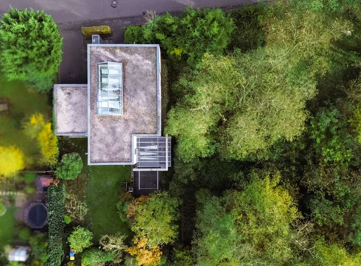 Damit es seine Wirkung entfalten kann, wurde ein Grundstück gewählt, das Ruhe und Abstand bietet. Durch die besondere Lage – mit einer leicht erhöhten Zufahrtsstraße und einem tiefer liegenden Garten – öffnet sich das Haus auf faszinierende Weise zur Natur hin: oben empfängt es seine Bewohner, unten entfaltet sich das Leben.