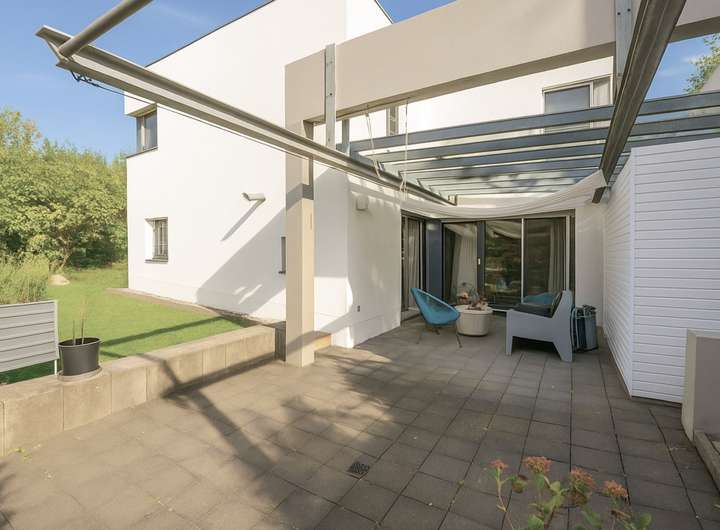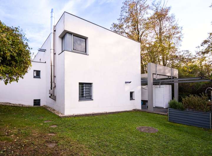 Die klare, reduzierte Architektur trägt die Handschrift der klassischen Moderne. Großzügige weiße Wandflächen und bewusst gesetzte Fensteröffnungen verleihen dem Haus eine stille Eleganz, die sich sowohl außen als auch innen widerspiegelt. Hier geht es nicht um laute Gesten, sondern um feine Spannung, um Harmonie und um das Spiel von Licht und Raum.
